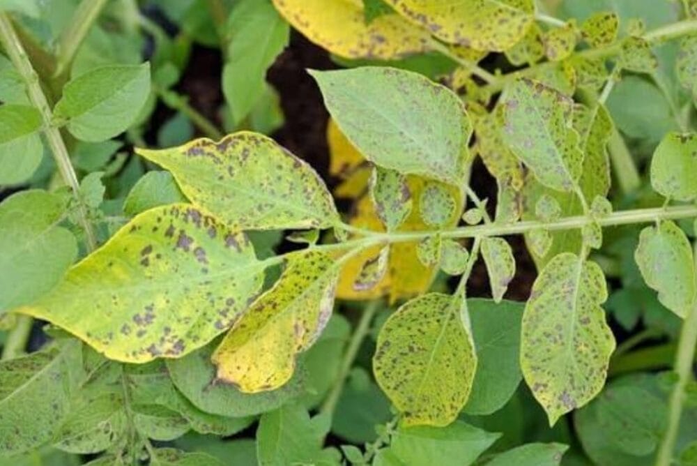 Small brown spots with concentric rings appear on leaves, giving a “target-like” appearance. Leaves may turn yellow and fall prematurely, reducing tuber size.